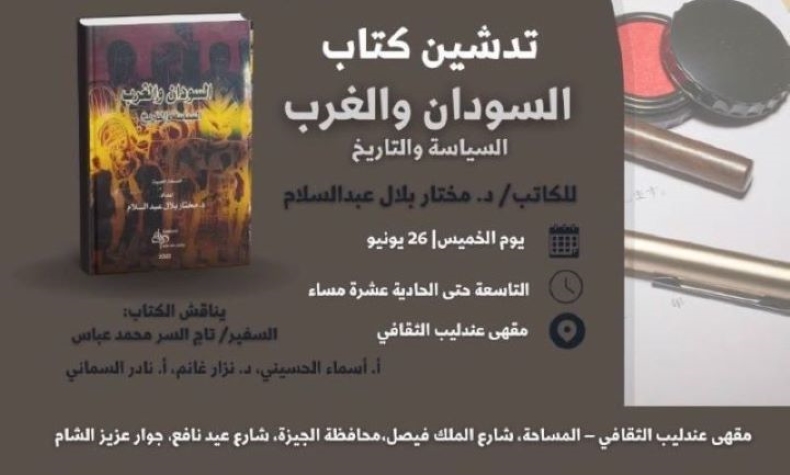 ينظم مقهى عندليب الثقافي في محافظة الجيزة أمسية ثقافية متميزة مساء الخميس 26 يونيو، للاحتفاء بتدشين كتاب “السودان والغرب: السياسة والتاريخ” من تأليف الدكتور مختار بلال عبدالسلام، والصادر عن منشورات عندليب.
